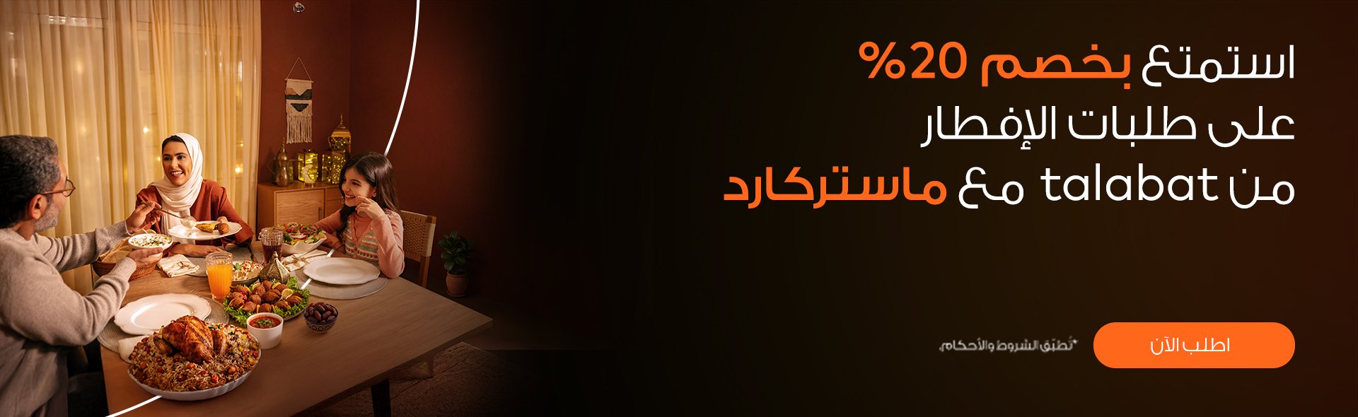 احصل على خصم 20% على طلبات البقالة أو الطعام مرتين شهرياً عند الطلب عبر تطبيق “طلبات” والدفع باستخدام أي من بطاقات ماستركارد™ المؤهلة وإدخال الرمز الترويجي MASTERCARD.